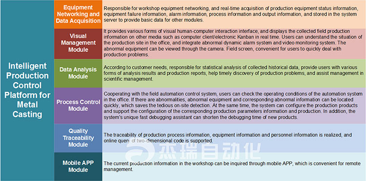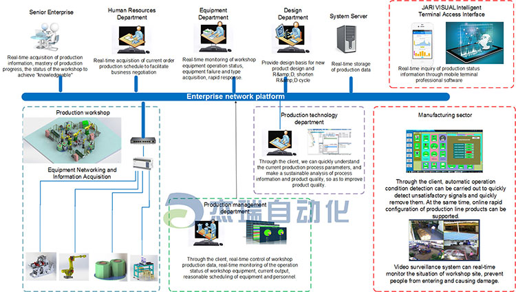 JARI's intelligent production management and control platform consists of ERP, MES, SCADA, ID.JARI provides customers with automated production equipment, automated storage equipment, automated logistics transfer system, intelligent management information system integration scheme to improve the production capacity ,management level, enterprise image of enterprises.JARIs goal is to realize automation production in the whole factory through FMS, GT, MIS, CIMS and so on.